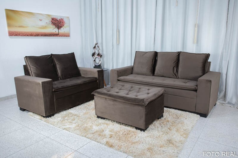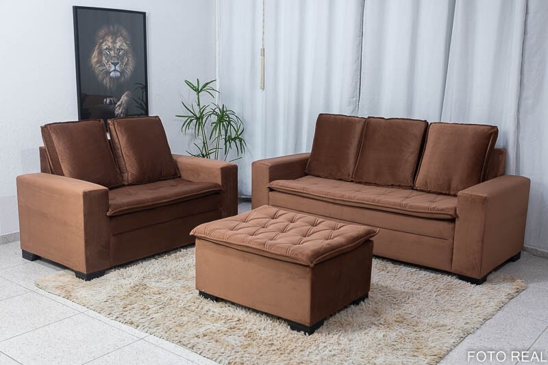 Sofá 3 e 2 lugares França com Puff Veludo Marrom A17