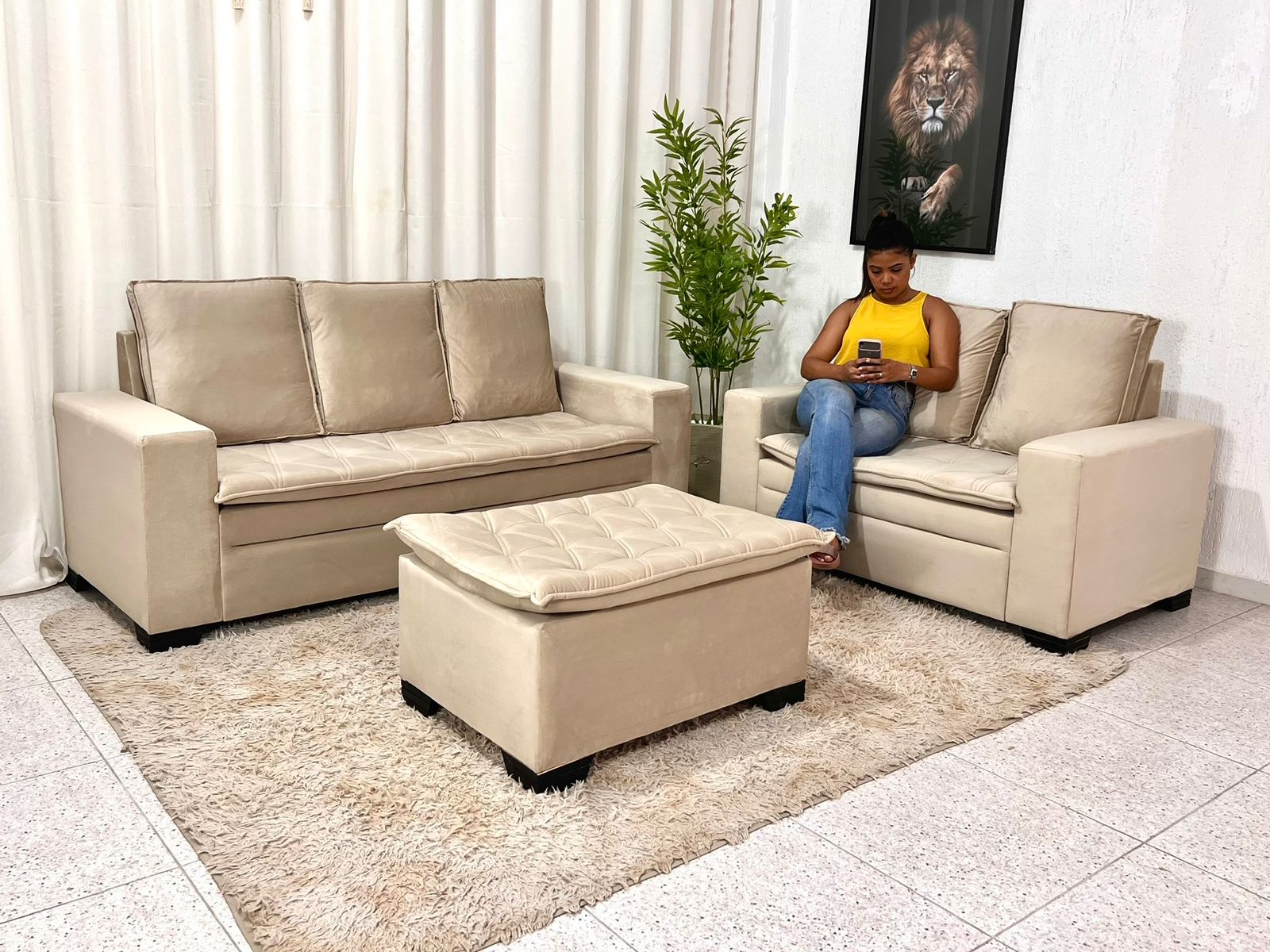 Sofá 3 e 2 lugares França com Puff Veludo Bege A32 Larg. 1.86m
