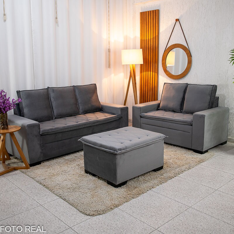 Sofá 3 e 2 lugares França com Puff Veludo Cinza A15 Larg. 1.86m
