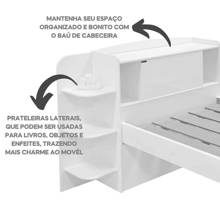 – Prateleira laterais que podem ser usadas para colocar livros, objetos e enfeites. Além disso pode ser montada em ambos os lados da cabeceira.