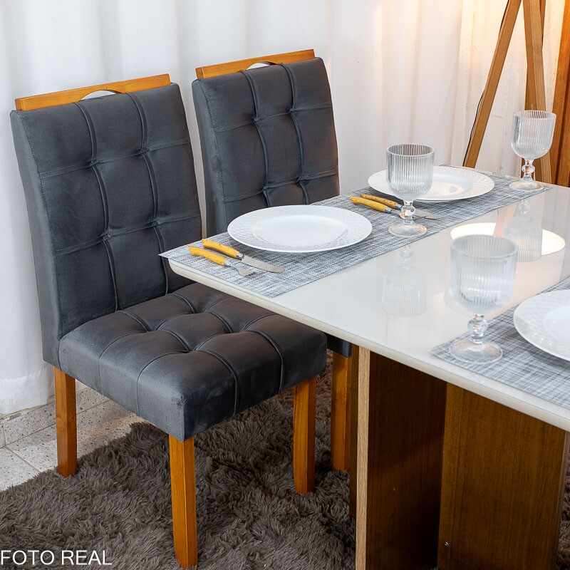 3{%%}Descrição{%%}Mesa de Jantar Moscou 90×90 Vidro Off/Base Cinamomo + 4 Cad. Londres Veludo Chumbo Madeira Maciça Minas Plac – Entregue Montada